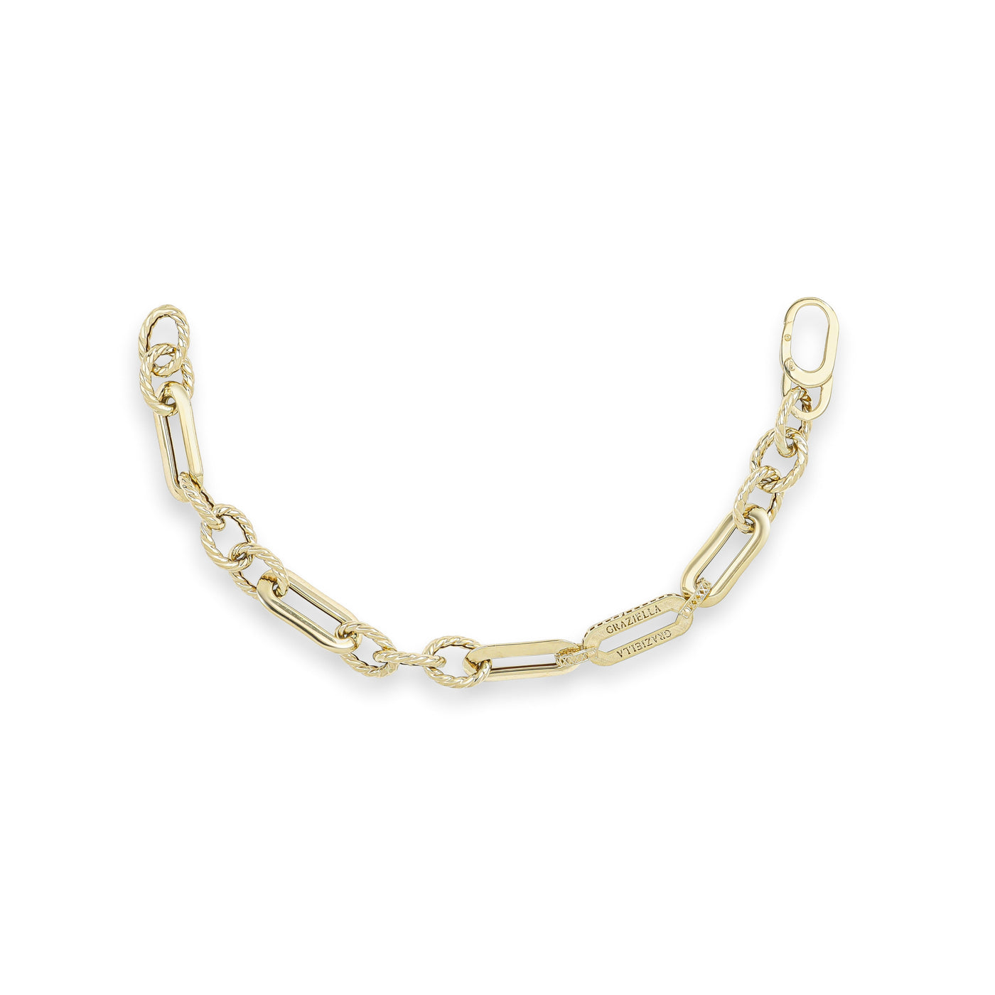 The Intrecci bracelet is an icon of contemporary style, crafted with an alternating link that combines polished elements and rope-like woven sections, creating a refined interplay of contrasts and textures. Crafted from 18kt yellow gold, it is a bold yet extremely versatile piece, enhanced by mother-of-pearl detailing.