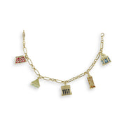 Le bracelet Orizzonti en or 18 carats est une invitation au voyage, avec votre regard et votre style. Sa chaîne moderne et légère est ornée de cinq breloques en émail alternées représentant certains des monuments les plus emblématiques du monde : le Colisée, la Pyramide, le Panthéon, la Tour de Pise et le Taj Mahal. Chaque détail est minutieusement travaillé et sublimé par des émaux aux couleurs éclatantes pour un effet riche, vibrant et raffiné.